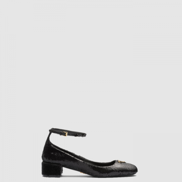 • [PRADA-프라다]삼각로고 시퀸 새틴  앵클 스트랩 펌프스